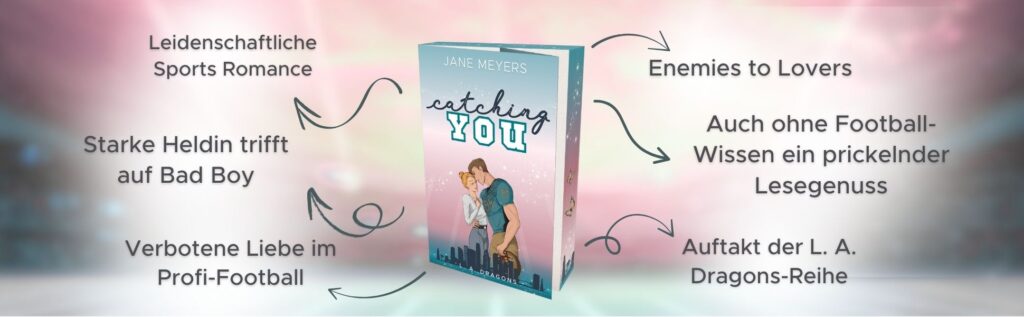 Die neue Jane Meyers Football Romance „Catching YOU“ ist perfekt für alle Fans von Enemies to Lovers, bzw. Haters to Lovers, Forced Proximity, Workplace Romance, He Falls First und verbotener Anziehung mitten im Trubel eines fiktiven Profi-Footballteams in Los Angeles.